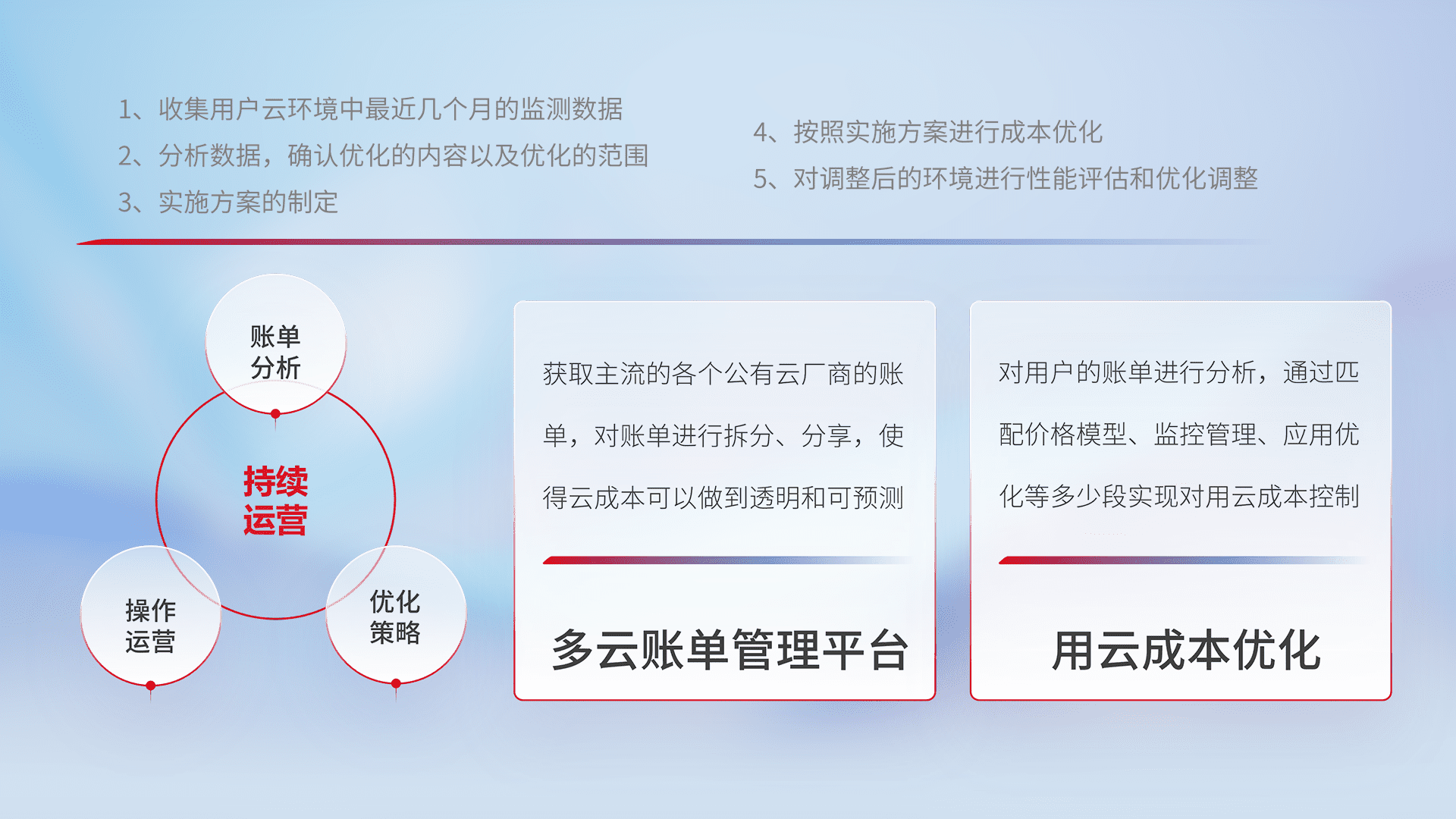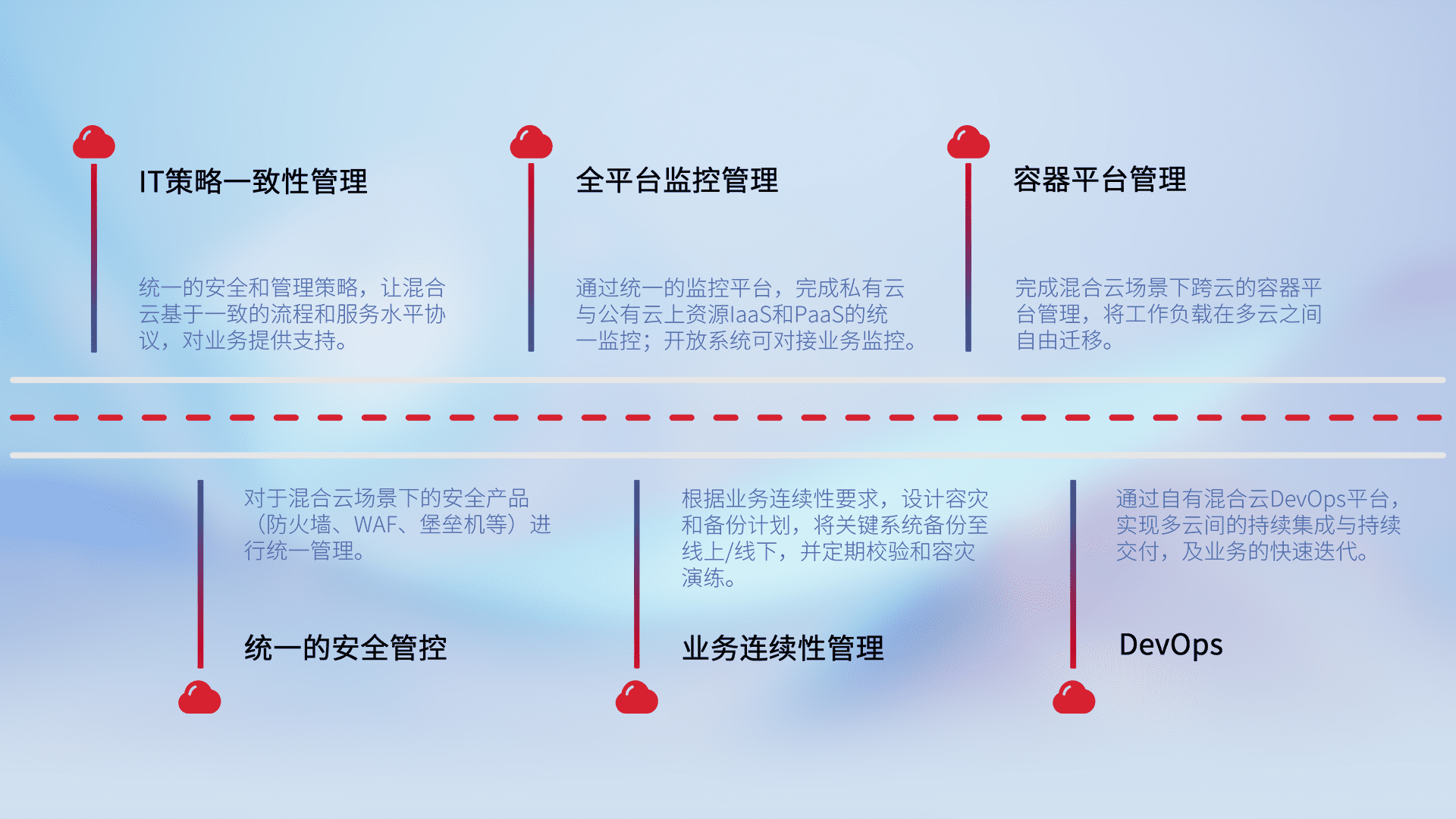 通过多云纳管,,以统一的资源数据模型把客户的云资源进行抽象和封装,,,,进而实现对多云资源的统一操作,,保障云资源管理的可靠性、、、、稳定性与可用性。。。。量身定制化运维内容,,,,配置、、、、开发运维、、、、补丁管理、、、、备份、、监控、、、、认证和访问管理、、、审计和日常巡检等,,保障在用云过程中的可靠度,,,,稳定度以及高可用率。。。