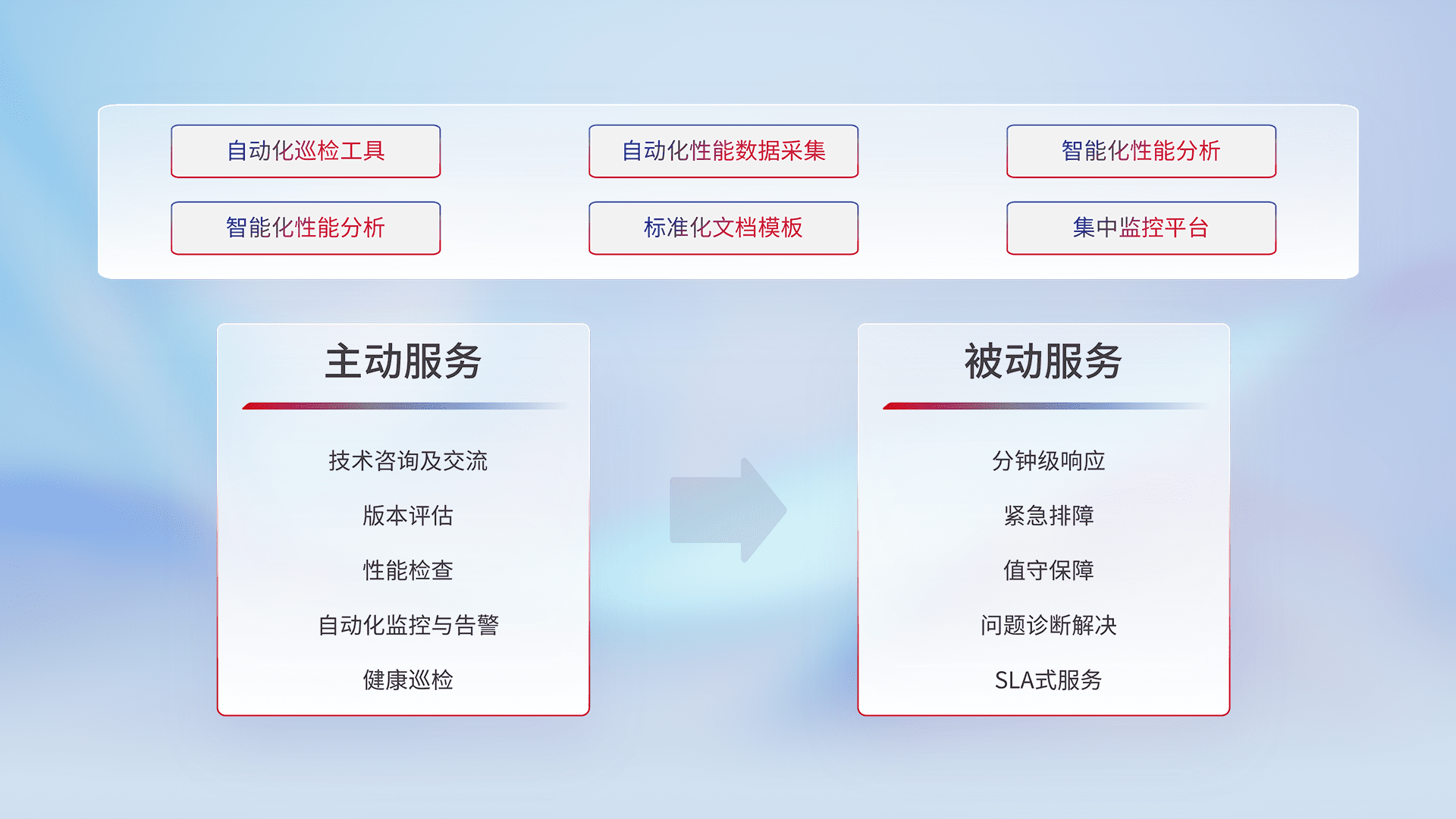 智能化工具和标准化文档,,,,保障服务质量,,,,提供主动服务(包含技术咨询、、、版本评估、、、、性能检查、、、自动化监控与告警、、、健康巡检)和被动服务包含(分钟级响应、、紧急排障、、、、值守保障、、、问题诊断解决、、、SLA服务)。。。。